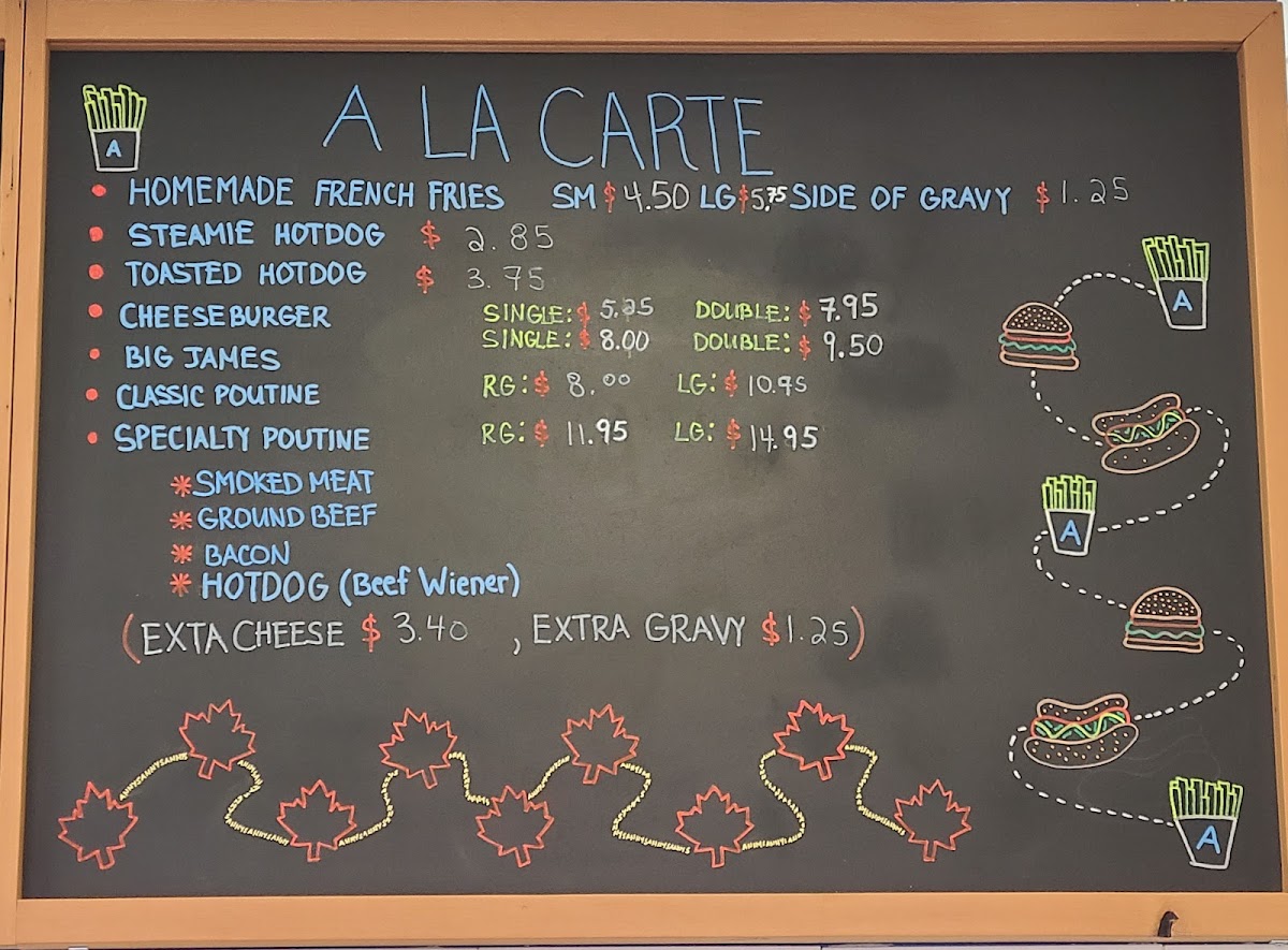 Welcome to Anny's Dairy Bar, your go-to spot in New Westminster, BC, where mouthwatering flavors and delightful treats await! Our menu is a delightful fusion of classic comfort food and sweet sensations, making it the perfect destination for food lovers. Start your culinary adventure with our signature Montreal Smoked Meat Poutine—it's a local favorite that you won't want to miss! For those with a sweet tooth, indulge in our Small Maple Twist Ice Cream Cone or the nostalgic Banana Split. Whether you’re in the mood for a hearty meal with our juicy James Burger or a comforting Montreal Smoked Beef Sandwich, we’ve got something to satisfy every craving. Don’t forget to pair your meal with our Homemade French Fries or try the classic Steamie Dogs with our delectable fries, gravy, and a drink combo. With so many delicious options, we invite you to come down to 722 6th St and experience the culinary charm that is Anny's Dairy Bar Menu!